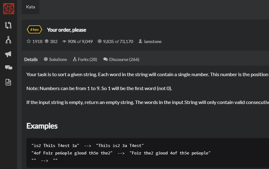 레벨링 시스템도 존재합니다. 'kyu'라고 부르는 이 레벨 시스템은 마스터 레벨과의 거리를 의미합니다. 그래서 처음 8 kyu에서 시작해서 레벨이 올라갈 때마다 7 kyu, 6 kyu 순으로 숫자가 내려갑니다. 마스터 레벨에 도달하면 거꾸로 숫자가 올라가는 시스템이라고 합니다. 태권도나 유도에서의 단수와 비슷하다고 보면 될 것 같습니다. 어릴 적 기억을 더듬어보면 검은 띠를 따기 전에 흰 띠에서 시작해서 노랑 띠 빨강 띠 이렇게 올라가다가 검은 띠를 따고 나면 1단, 2단 올라가는 것과 비슷한 시스템이라고 볼 수 있습니다.